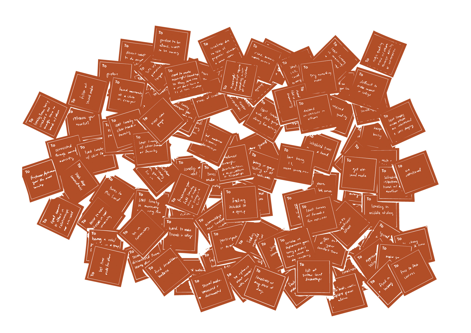 Through 15 interviews with college students, personal experience, and in-context immersion through blogs, I learned more about the problem of loneliness. I found that many of the interviewees said social media makes them feel disconnected and that they think it's easy to make friends in college, but hard to make meaningful friendships. I also found that a contributor to some types of loneliness can relate to a lack of intentional friendships. I collected all of the data and wrote them down on post-it notes to rearrange them into categories of emerging insights. These include making meaningful relationships, being busy/staying active, creating deeper connections, the importance of community, and being intentional about growing friendships.