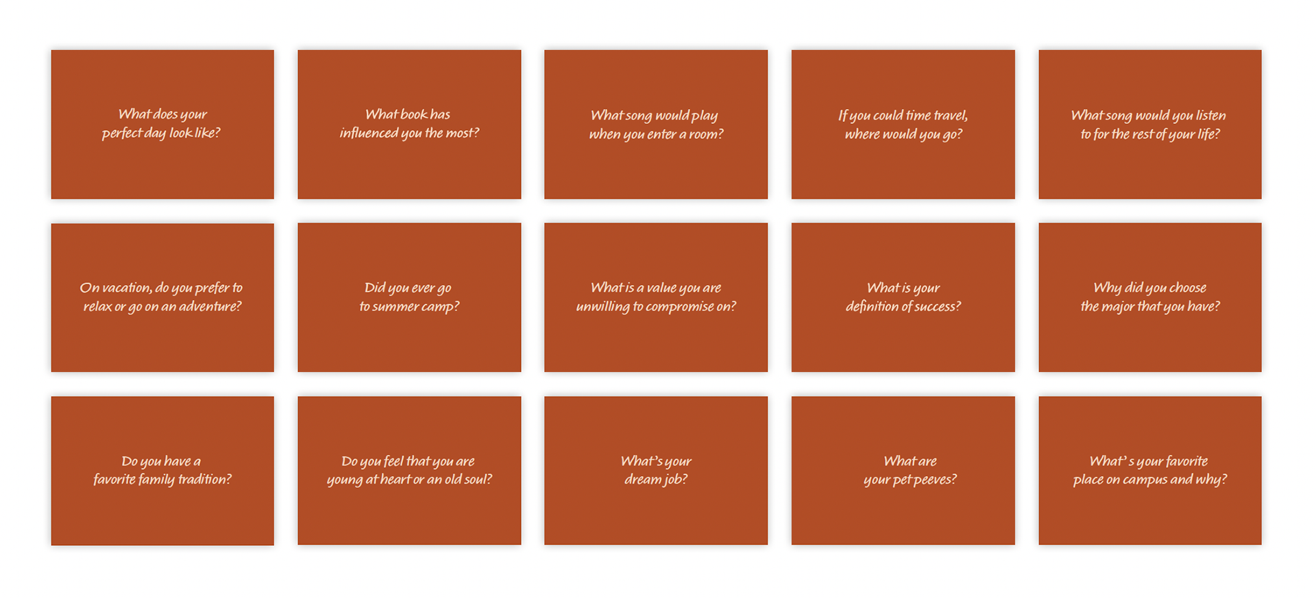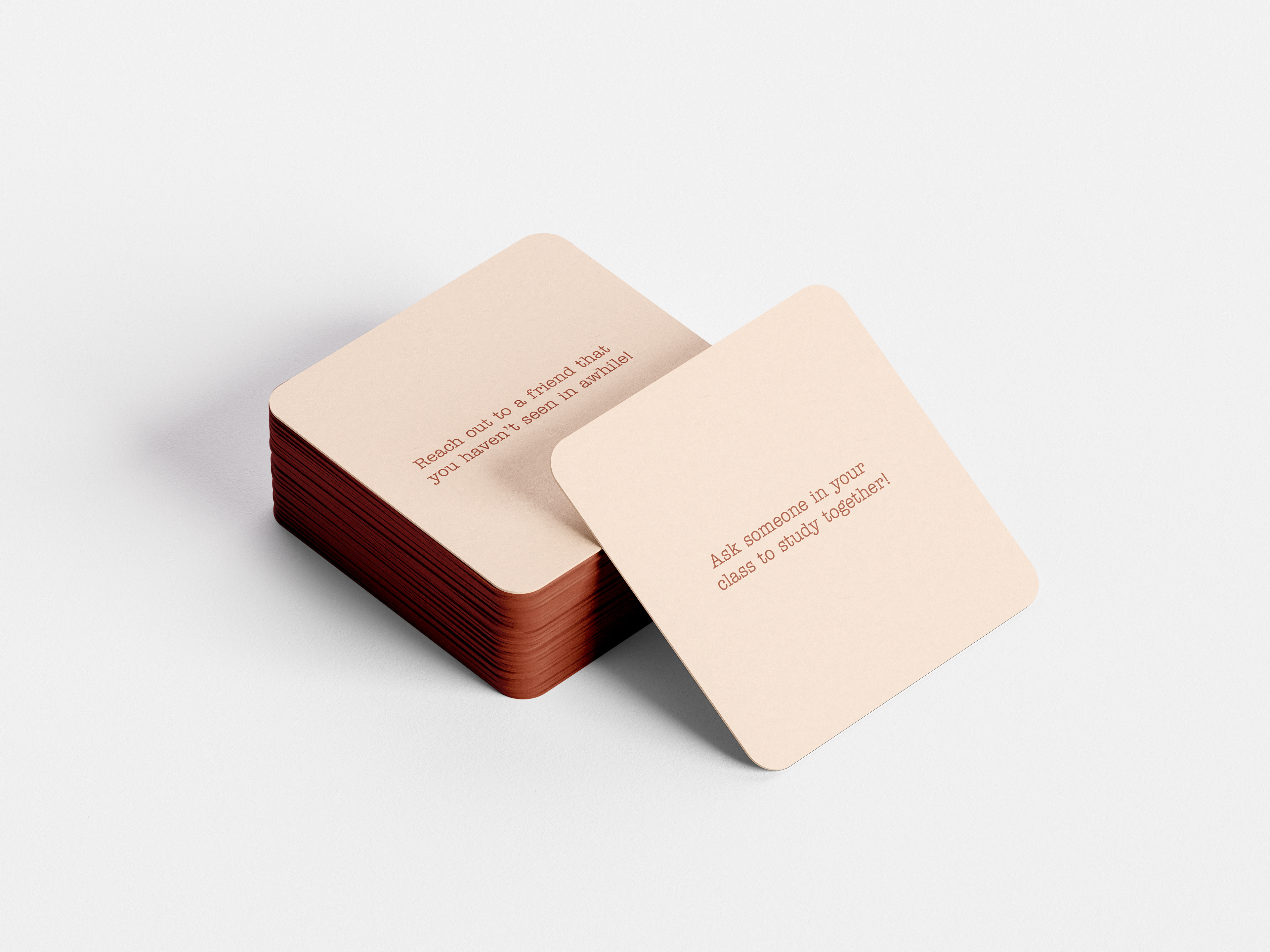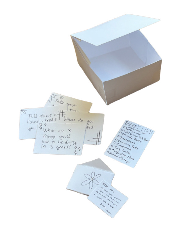 Sets of meaningful questions tailored to each of the kits to encourage intentionality through conversation. Each kit has different questions tailored to the user(s). For example, the close friends kit focuses on deepening friendships through more challenging questions, while the new friends kit is more about getting to know each other. The cards are 2x3" so that they are easy to carry around and use whenever.