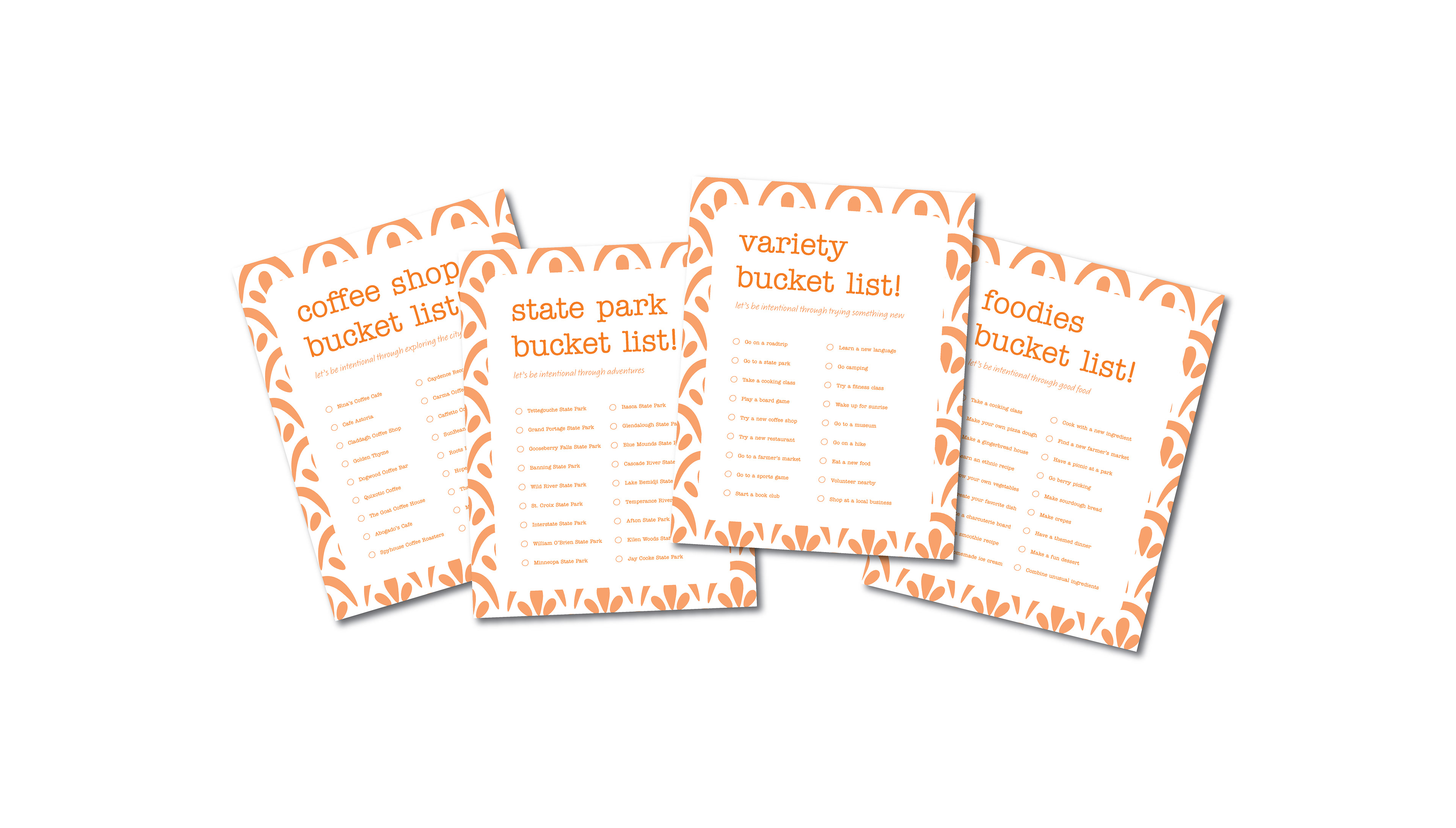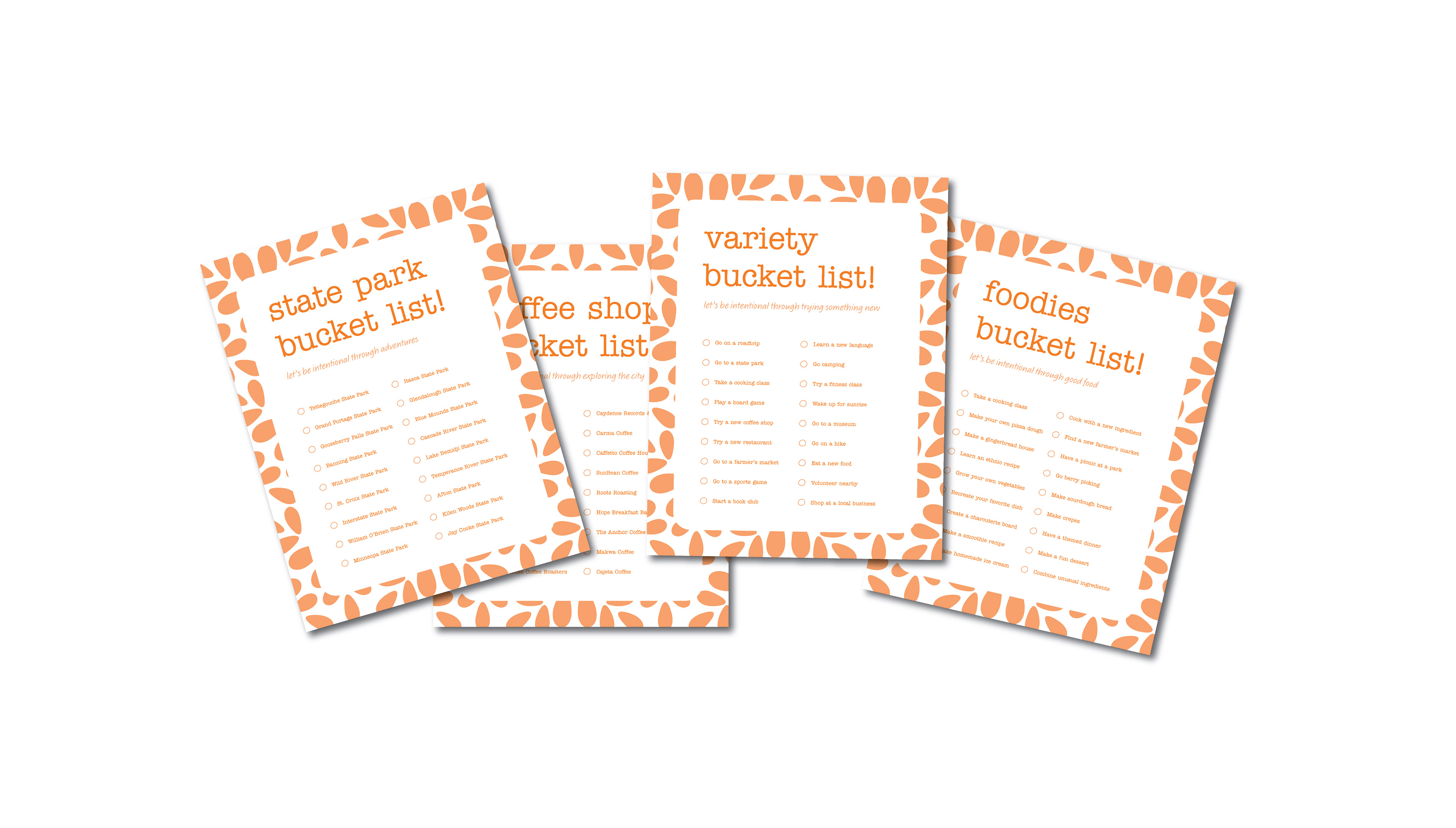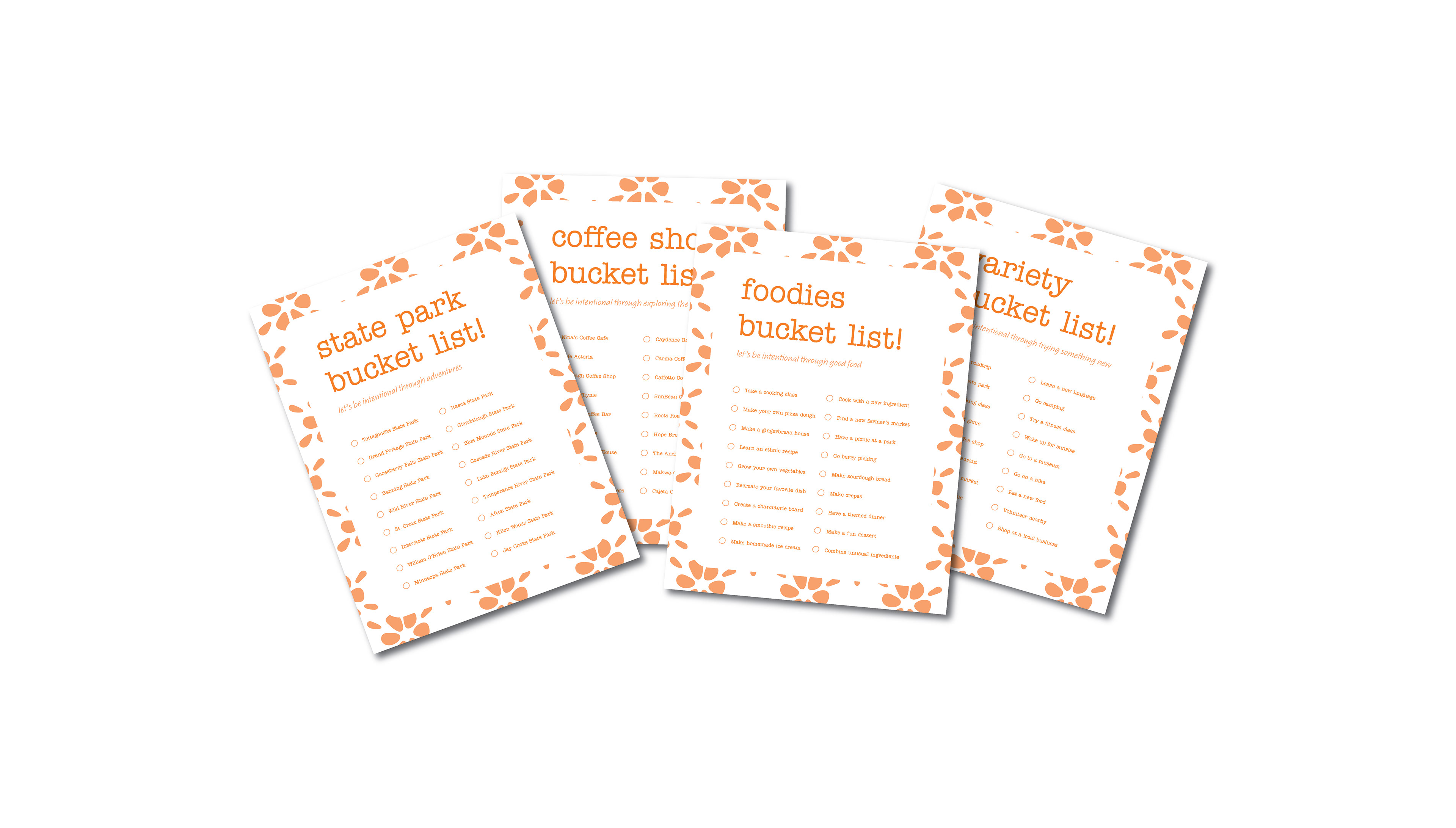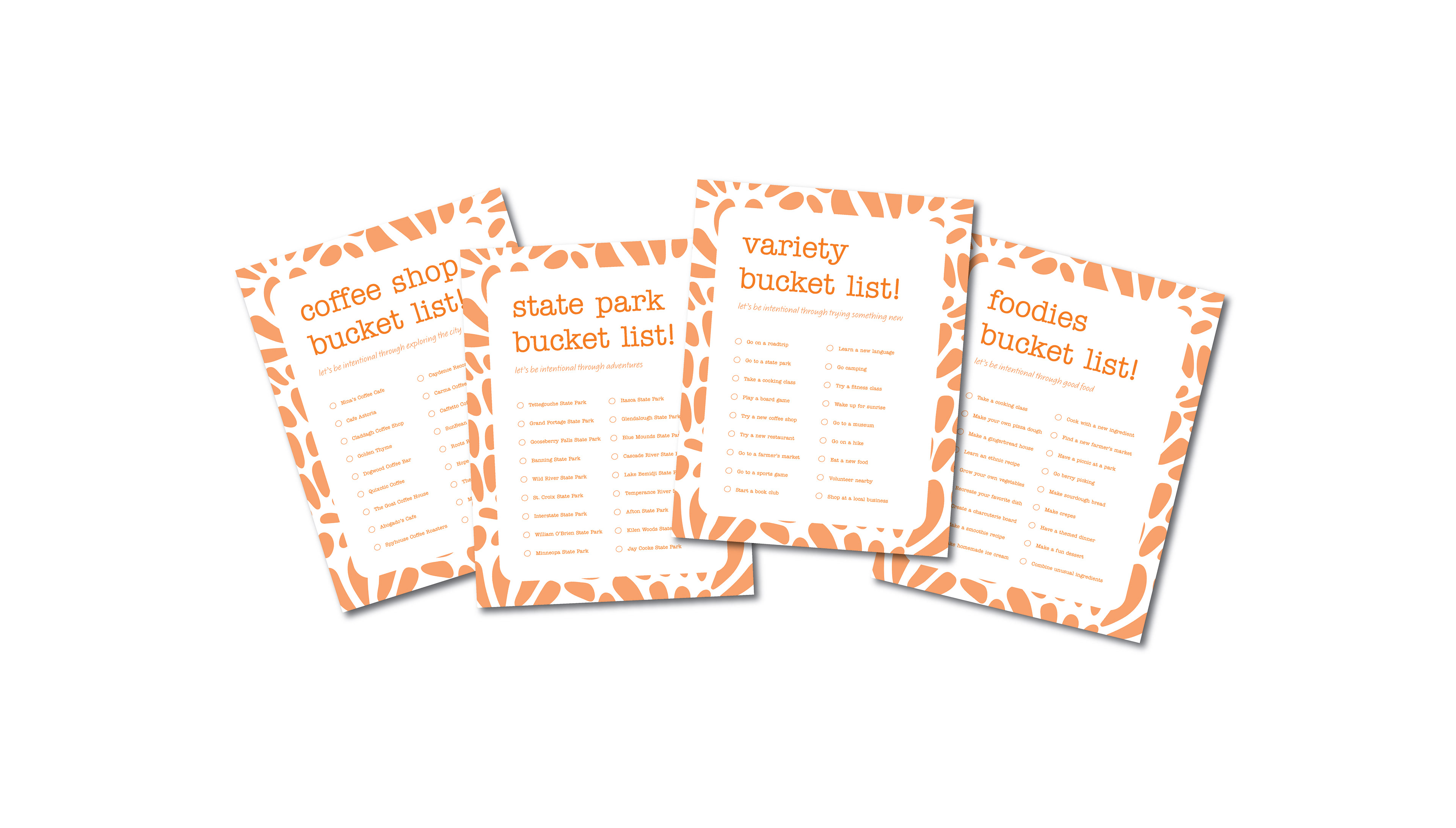 There are multiple bucket list categories to choose from in each kit to encourage spending time with one another through activities. These include state parks, coffee shops, foodies, variety, etc.