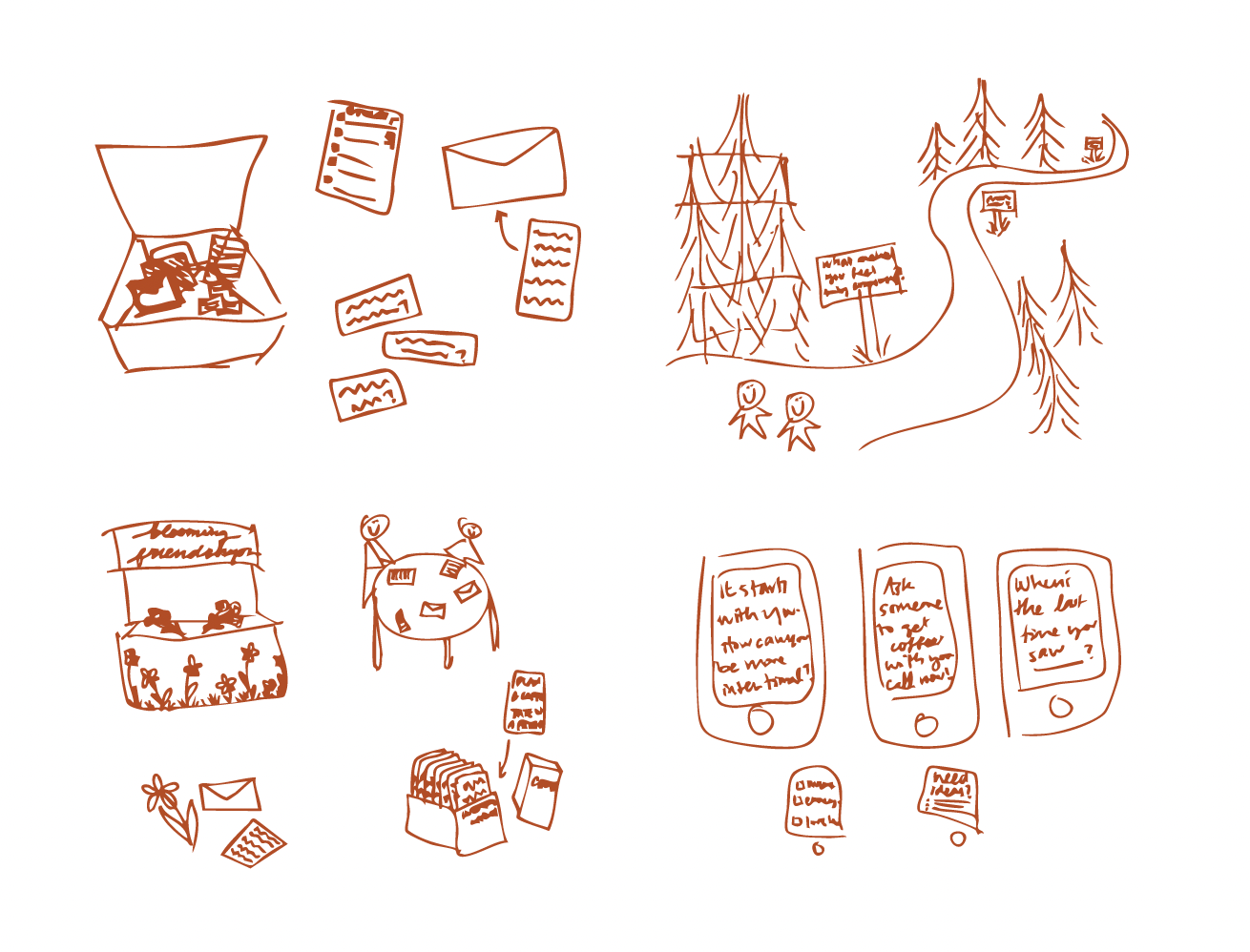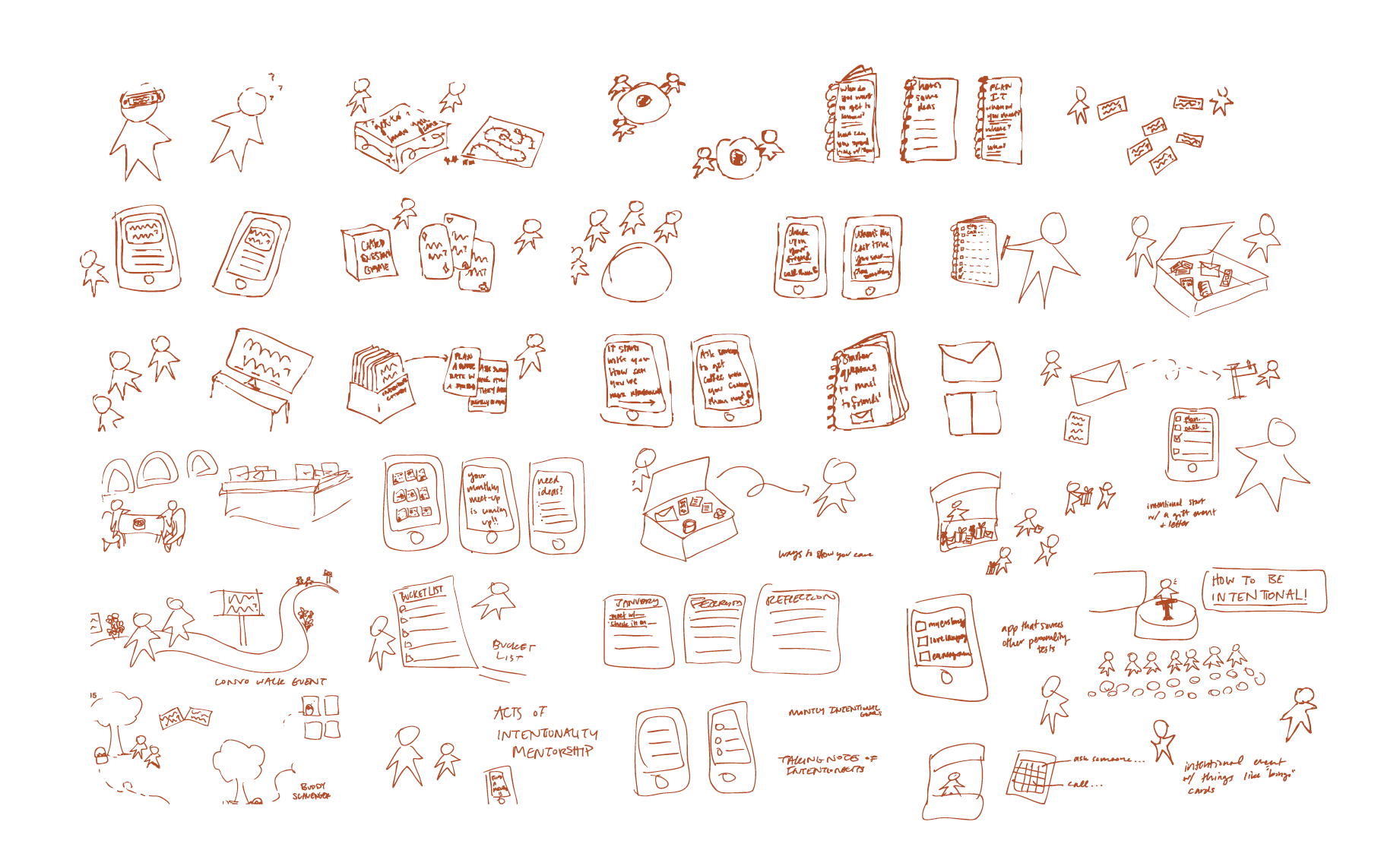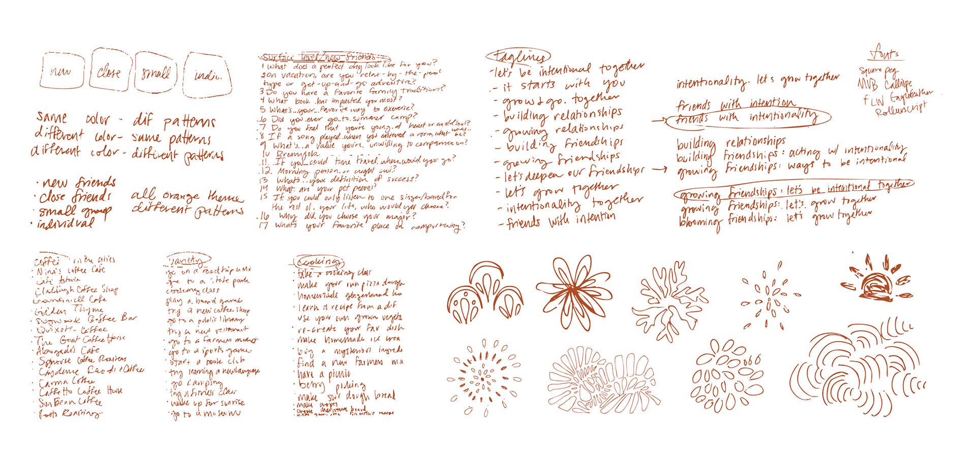 I created 30 sketches of possible ways for students to be intentional with one another. Then, I narrowed it down to the top four ideas. The four initial creative concepts consist of an intentional kit, a conversational walk event, a gift giving & writing event, and an app to help students be more intentional. After, I created a prototype of the intentional kit and its possible deliverables. With the main idea in mind, I brainstormed and made many refinements to finalize the project. I created three mood boards: blossoming, warm & friendly, and intentional. The direction I took was mostly warm, friendly, and intentional.