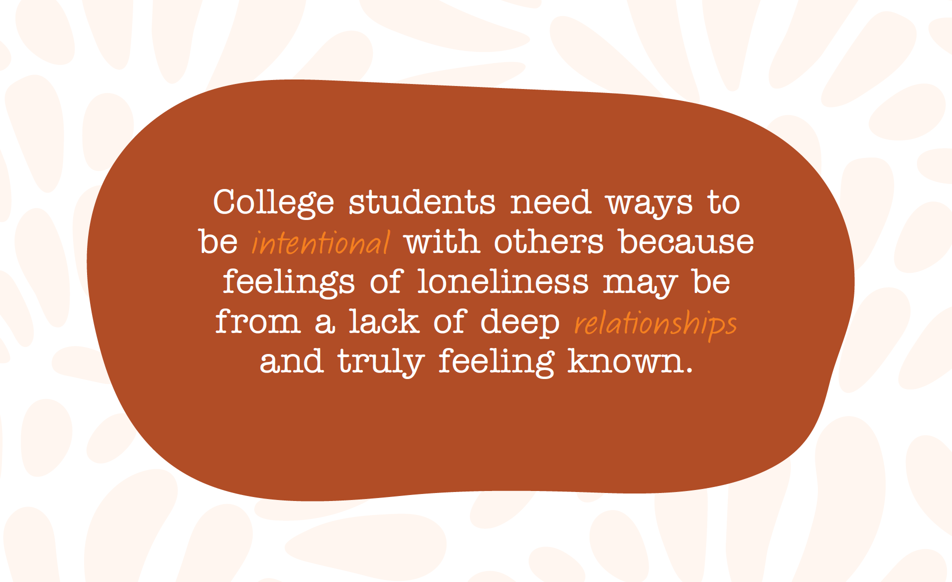 Loneliness is a growing problem among young adults-- specifically college students. Students are struggling to create deep and meaningful relationships with their peers and are feeling a lack of community. Some initial hypotheses include that increased use of social media is making it harder to create deep friendships from a lack of face to face interactions, difficulty for students to get past surface level friendships, and because of our individualistic culture that can lessen the need for community.