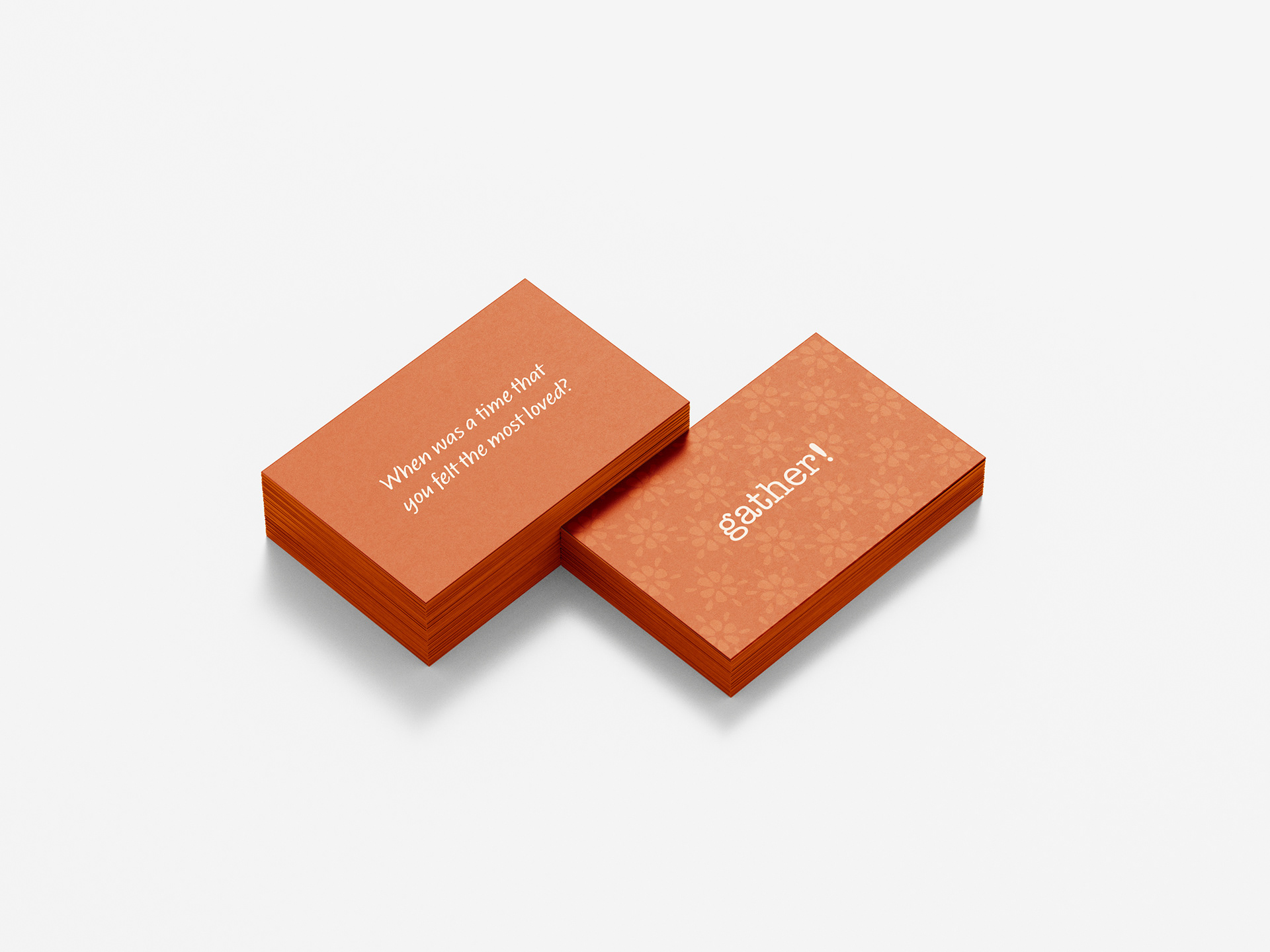 The project is called Gather! Gather creates personal kits for all types of college students to do with others or individually. These kits give students ways to be more intentional with one another through thoughtful conversation, activities, and intentional communication. There are four kits-- for new friends, close friends, small groups, and individuals. Each kit has an envelope and letter set, conversational questions tailored to its specific kit, and a bucket list of choice. The individuals kit has an additional piece of prompt cards. A website is used to advertise and shop the kits.